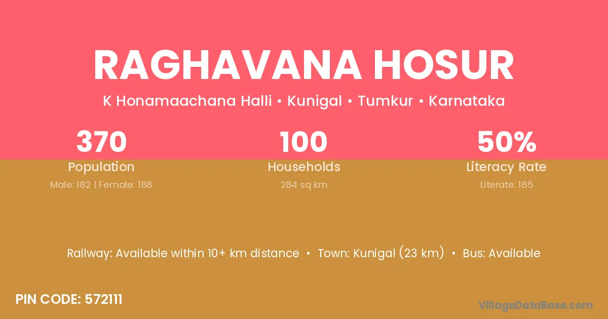 Kunigal (23 km) is the nearest town to Raghavana Hosur village for major economic activities and is located approximately 23 km away.