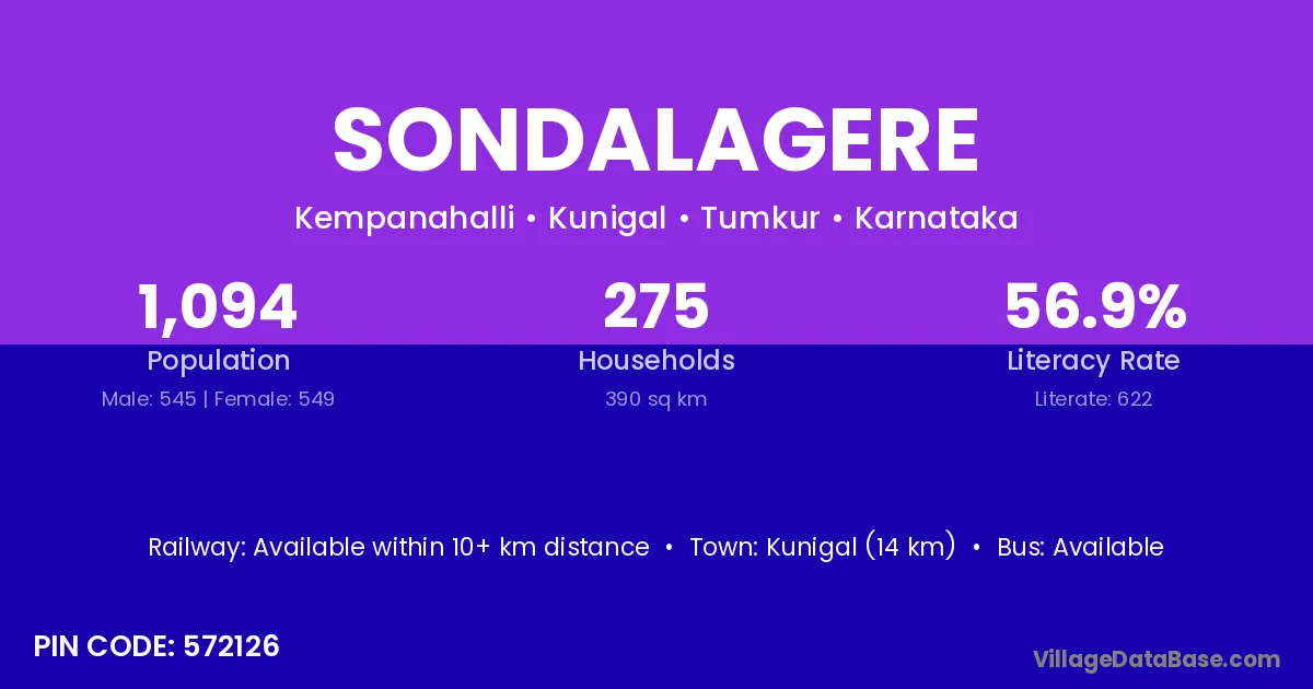 Kunigal (14 km) is the nearest town to Sondalagere village for major economic activities and is located approximately 14 km away.