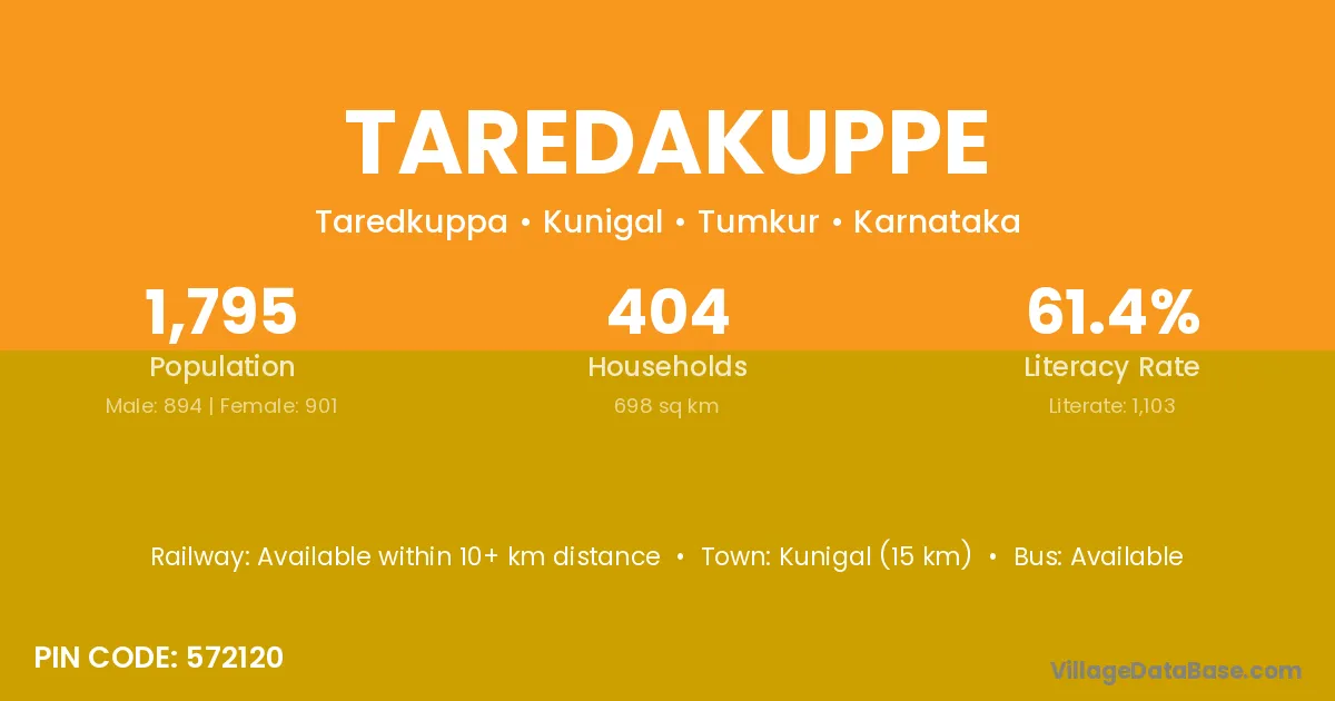 Kunigal (15 km) is the nearest town to Taredakuppe village for major economic activities and is located approximately 15 km away.