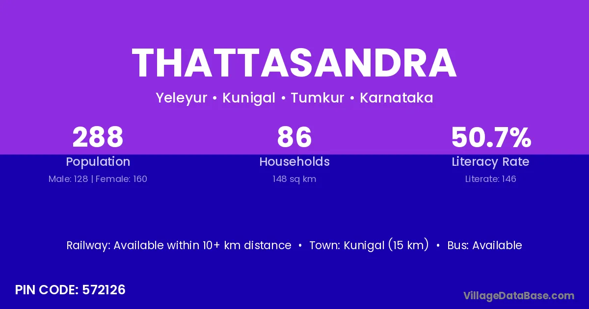 Kunigal (15 km) is the nearest town to Thattasandra village for major economic activities and is located approximately 15 km away.