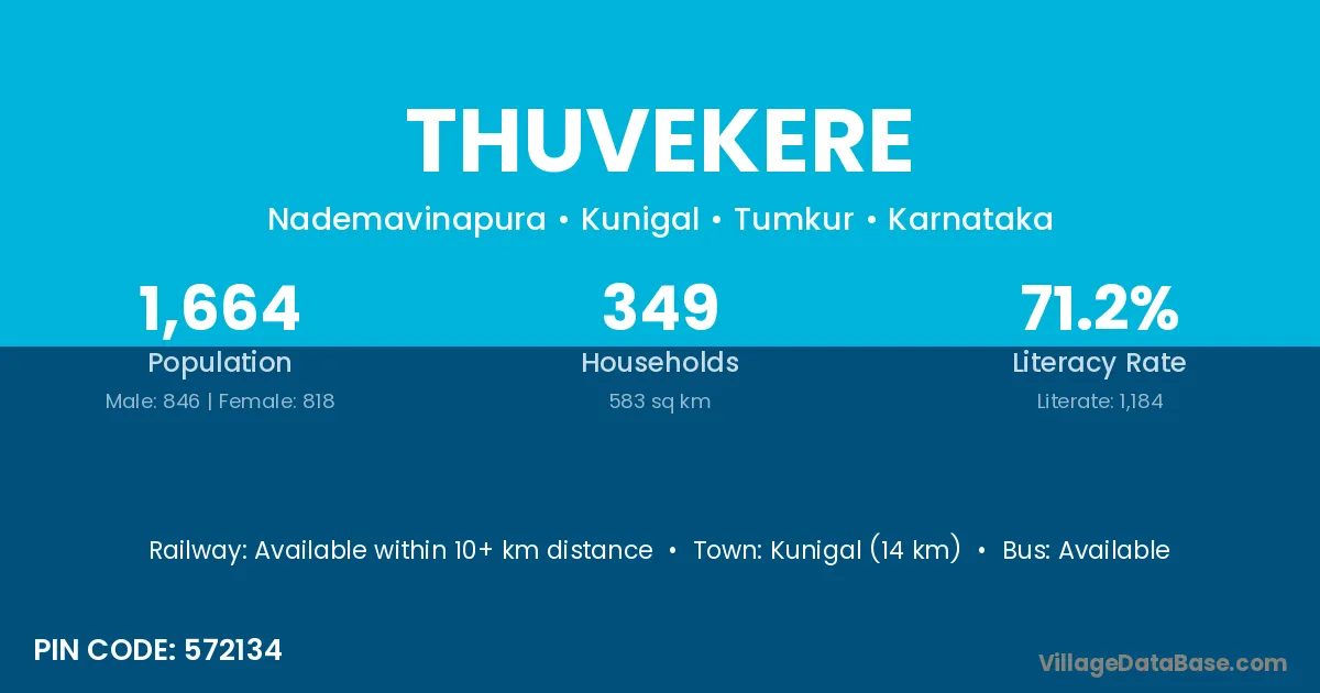 Kunigal (14 km) is the nearest town to Thuvekere village for major economic activities and is located approximately 14 km away.