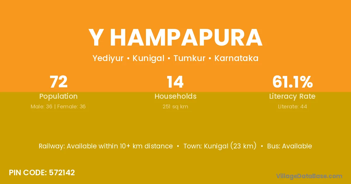 Kunigal (23 km) is the nearest town to Y Hampapura village for major economic activities and is located approximately 23 km away.