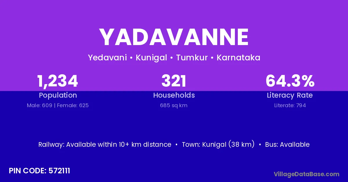 Kunigal (38 km) is the nearest town to Yadavanne village for major economic activities and is located approximately 38 km away.