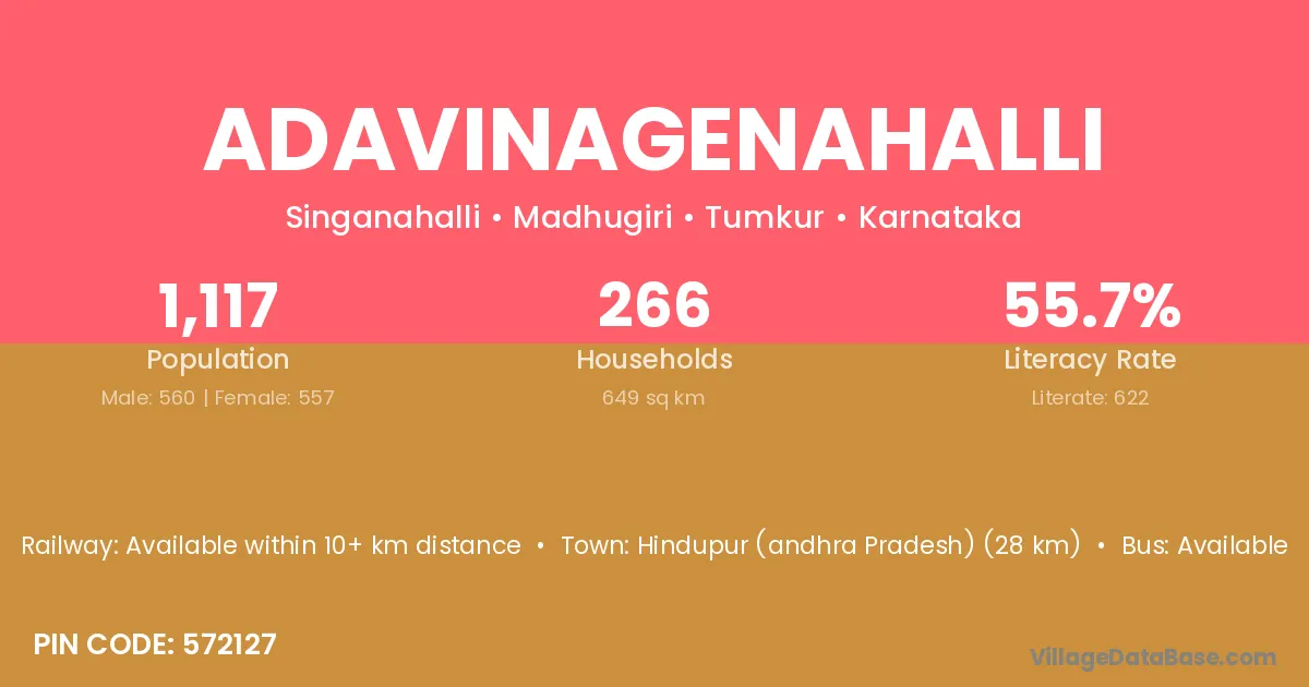 Adavinagenahalli village has a total population of 1,117 people, of which 560 are males and 557 are females.