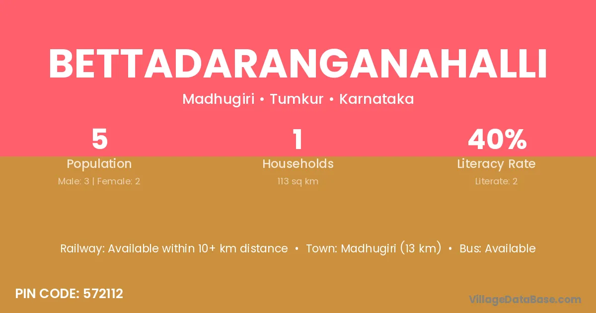 Bettadaranganahalli village has a total population of 5 people, of which 3 are males and 2 are females.
