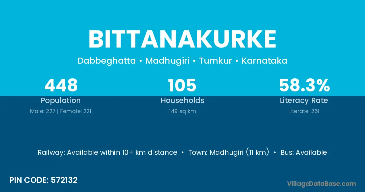 Madhugiri (11 km) is the nearest town to Bittanakurke village for major economic activities and is located approximately 11 km away.