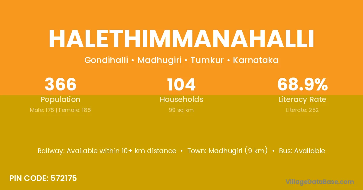 Madhugiri (9 km) is the nearest town to Halethimmanahalli village for major economic activities and is located approximately 9 km away.
