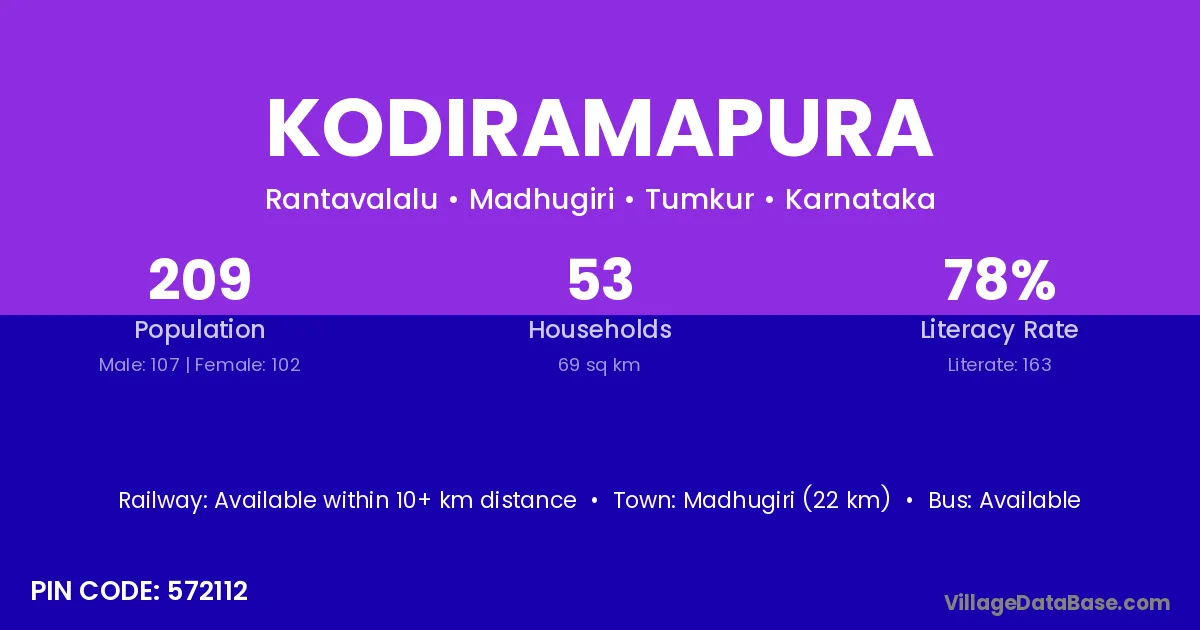 Madhugiri (22 km) is the nearest town to Kodiramapura village for major economic activities and is located approximately 22 km away.