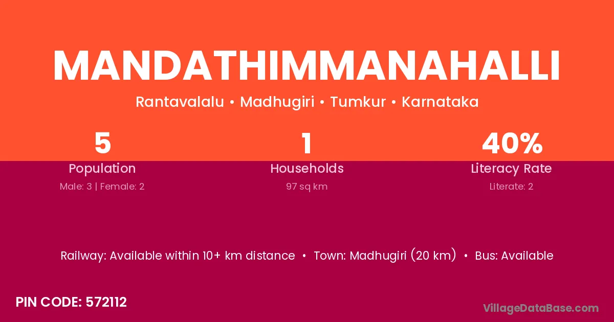 Madhugiri (20 km) is the nearest town to Mandathimmanahalli village for major economic activities and is located approximately 20 km away.