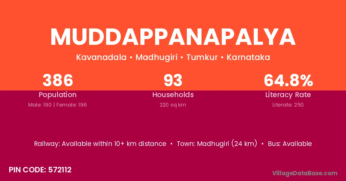Madhugiri (24 km) is the nearest town to Muddappanapalya village for major economic activities and is located approximately 24 km away.