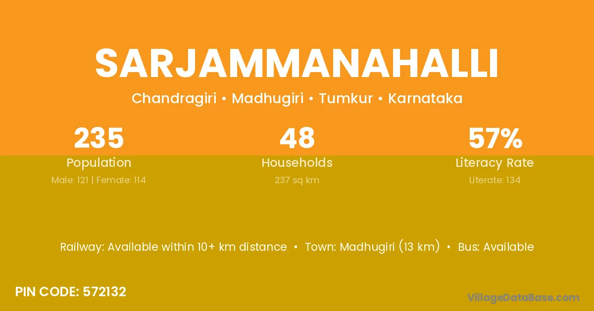 Madhugiri (13 km) is the nearest town to Sarjammanahalli village for major economic activities and is located approximately 13 km away.
