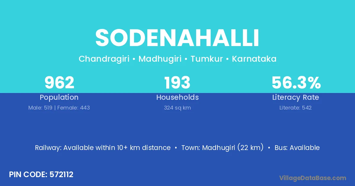 Madhugiri (22 km) is the nearest town to Sodenahalli village for major economic activities and is located approximately 22 km away.