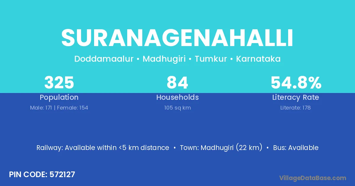 Madhugiri (22 km) is the nearest town to Suranagenahalli village for major economic activities and is located approximately 22 km away.
