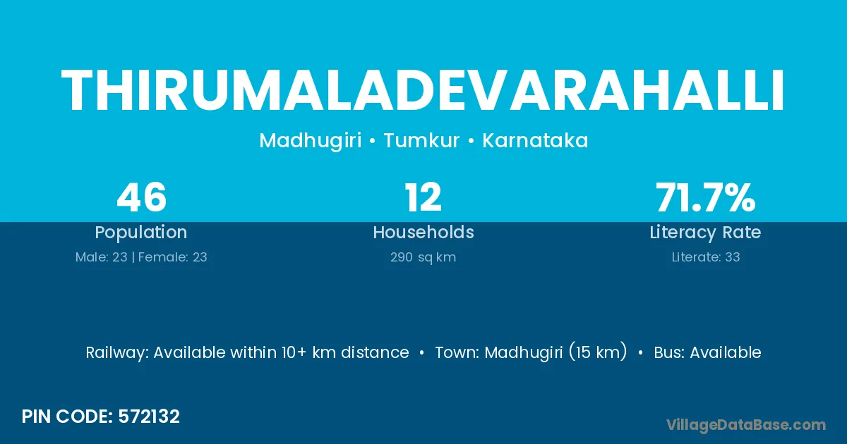 Madhugiri (15 km) is the nearest town to Thirumaladevarahalli village for major economic activities and is located approximately 15 km away.
