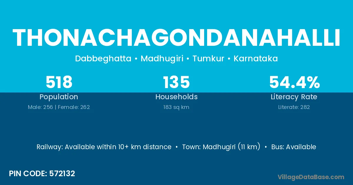 Madhugiri (11 km) is the nearest town to Thonachagondanahalli village for major economic activities and is located approximately 11 km away.