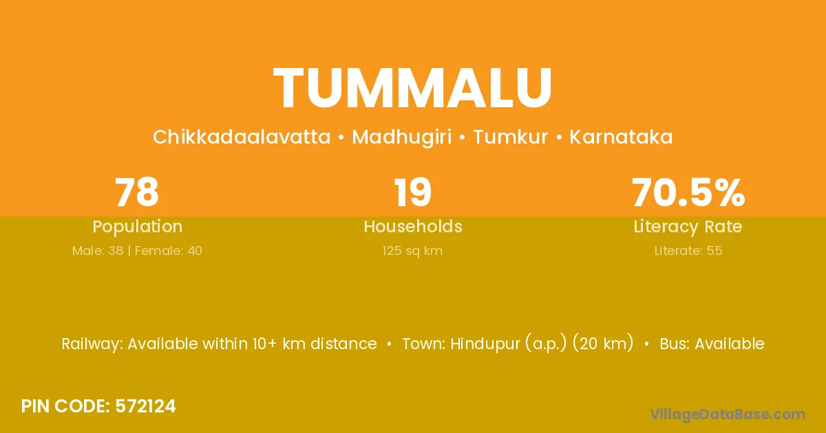 Hindupur (a.p.) (20 km) is the nearest town to Tummalu village for major economic activities and is located approximately 20 km away.