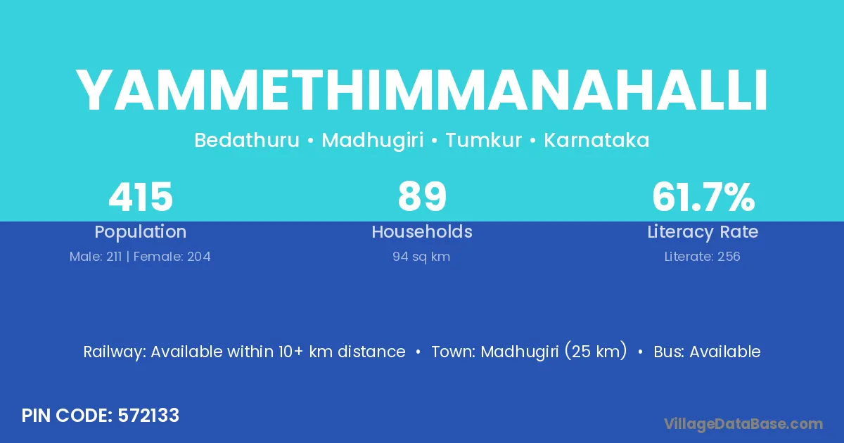 Madhugiri (25 km) is the nearest town to Yammethimmanahalli village for major economic activities and is located approximately 25 km away.
