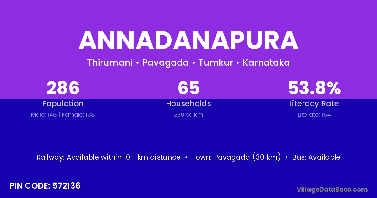 Pavagada (30 km) is the nearest town to Annadanapura village for major economic activities and is located approximately 30 km away.