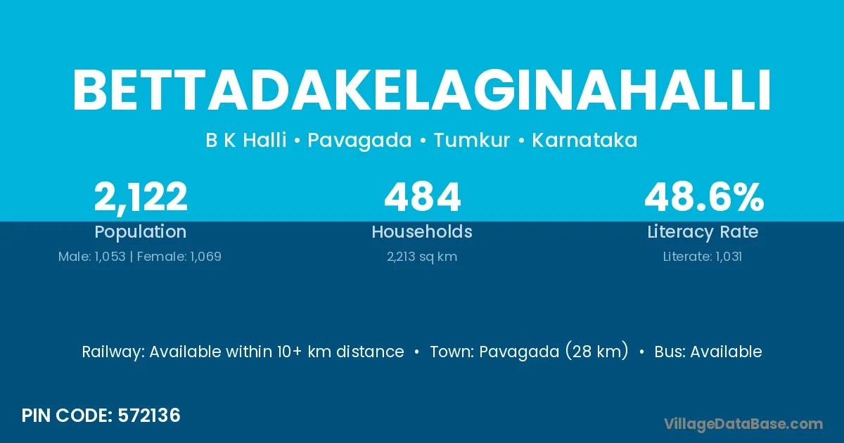 Bettadakelaginahalli village has a total population of 2,122 people, of which 1,053 are males and 1,069 are females.