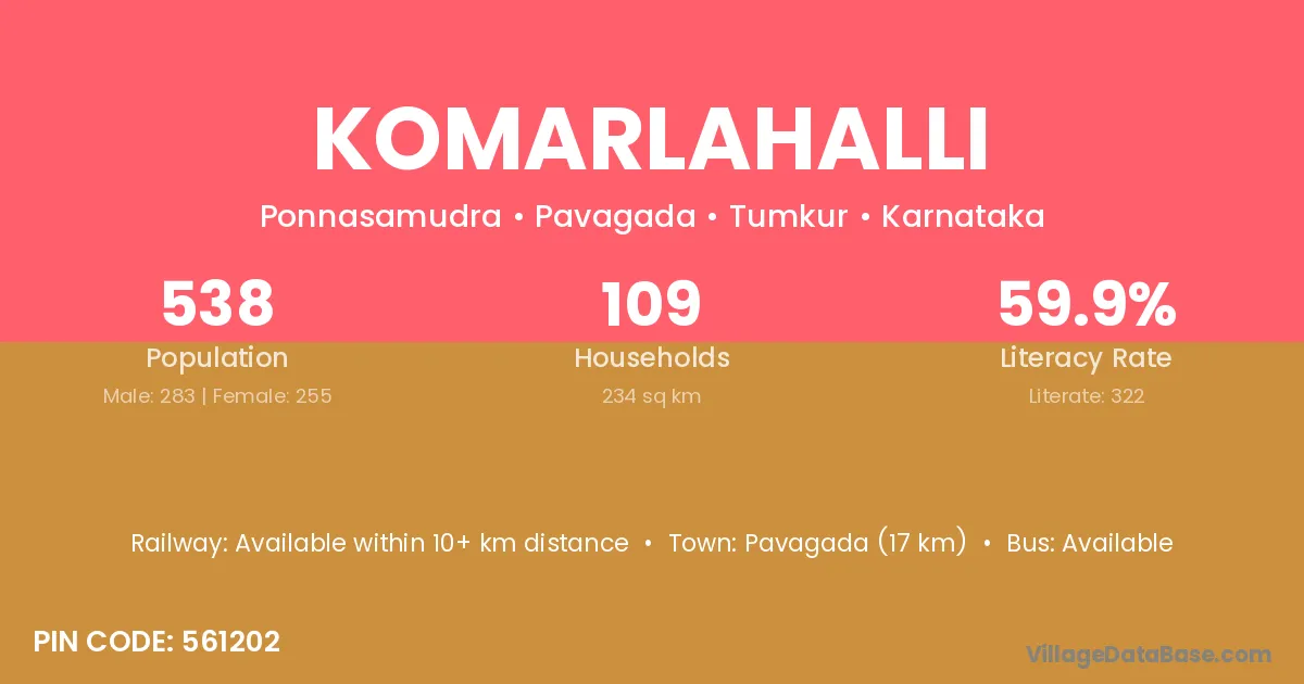 Pavagada (17 km) is the nearest town to Komarlahalli village for major economic activities and is located approximately 17 km away.