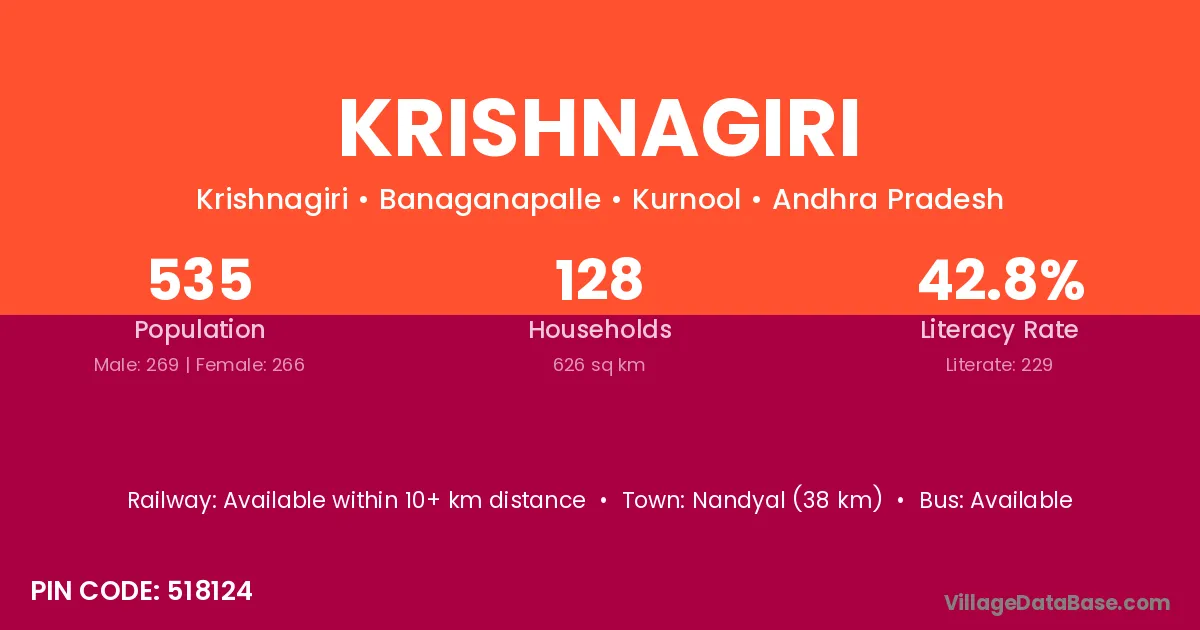 Pavagada (12 km) is the nearest town to Krishnagiri village for major economic activities and is located approximately 12 km away.