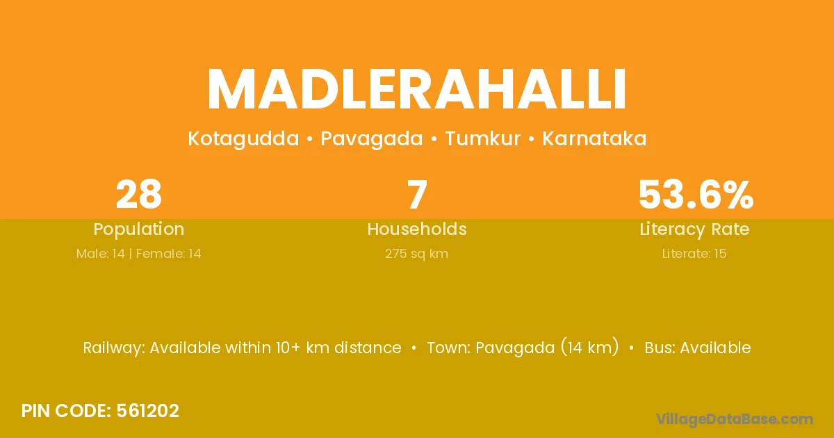 Pavagada (14 km) is the nearest town to Madlerahalli village for major economic activities and is located approximately 14 km away.