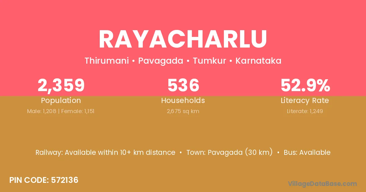 Pavagada (30 km) is the nearest town to Rayacharlu village for major economic activities and is located approximately 30 km away.