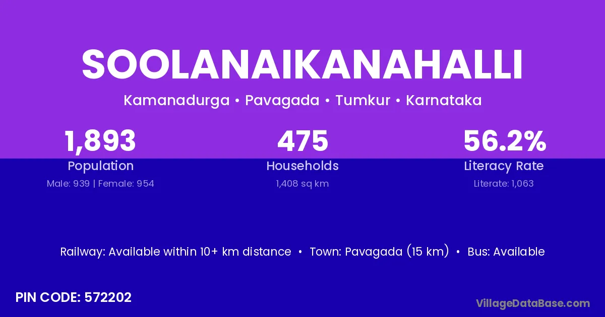 Pavagada (15 km) is the nearest town to Soolanaikanahalli village for major economic activities and is located approximately 15 km away.