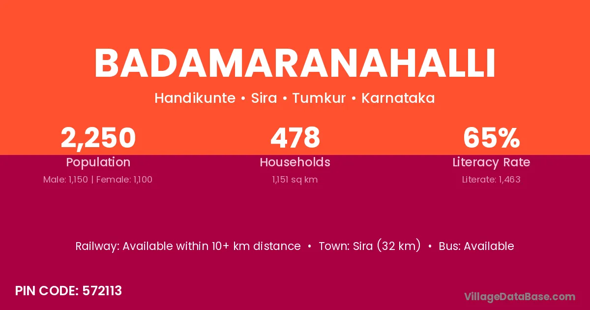 Sira (32 km) is the nearest town to Badamaranahalli village for major economic activities and is located approximately 32 km away.