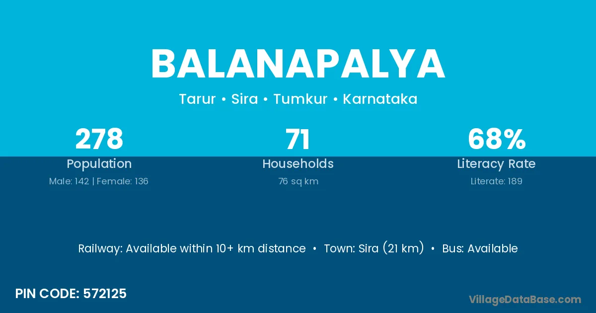 Sira (21 km) is the nearest town to Balanapalya village for major economic activities and is located approximately 21 km away.