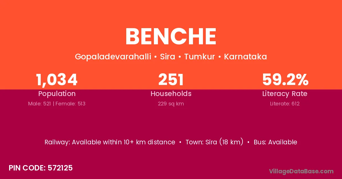 Benche village has a total population of 1,034 people, of which 521 are males and 513 are females.