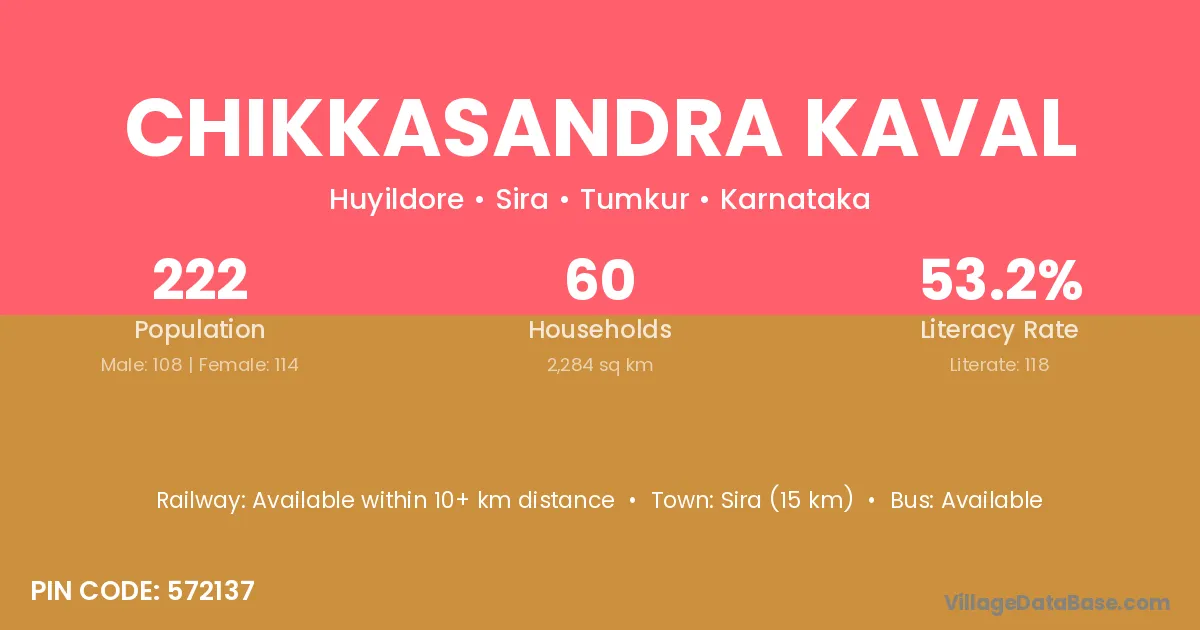 Chikkasandra Kaval village has a total population of 222 people, of which 108 are males and 114 are females.