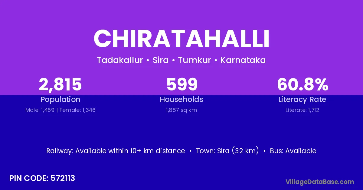Sira (32 km) is the nearest town to Chiratahalli village for major economic activities and is located approximately 32 km away.