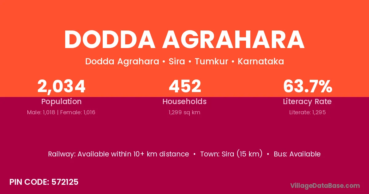Dodda Agrahara village has a total population of 2,034 people, of which 1,018 are males and 1,016 are females.