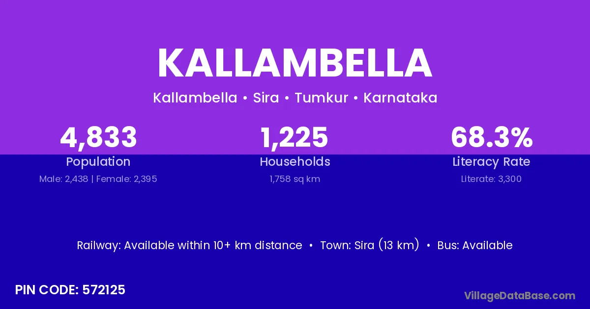 Sira (13 km) is the nearest town to Kallambella village for major economic activities and is located approximately 13 km away.