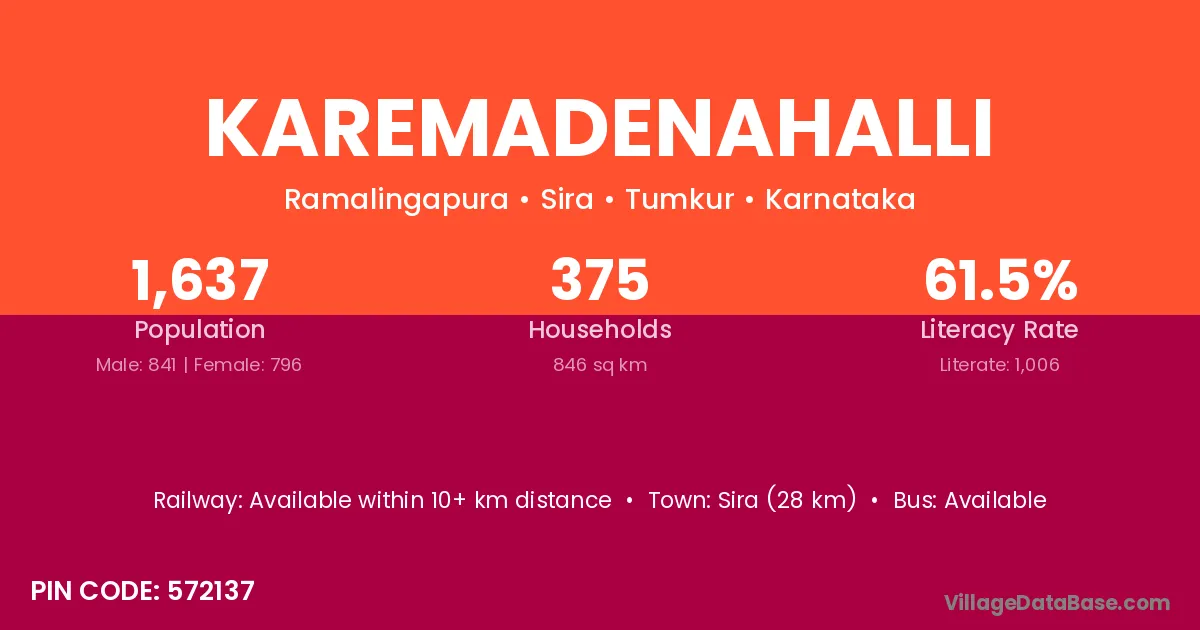 Sira (28 km) is the nearest town to Karemadenahalli village for major economic activities and is located approximately 28 km away.