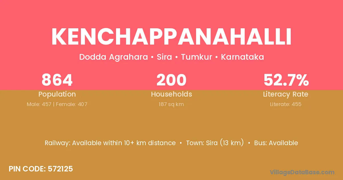 Sira (13 km) is the nearest town to Kenchappanahalli village for major economic activities and is located approximately 13 km away.