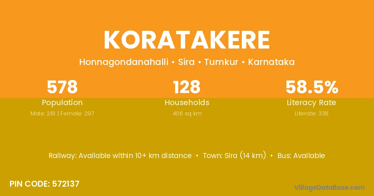 Koratakere village has a total population of 578 people, of which 281 are males and 297 are females.