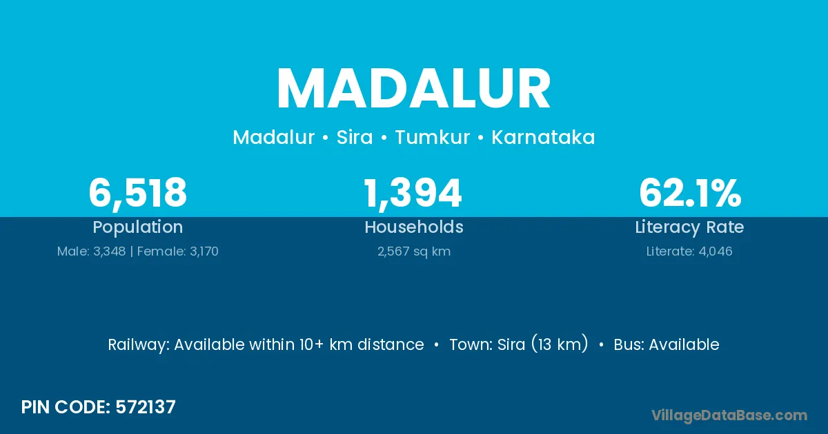 Sira (13 km) is the nearest town to Madalur village for major economic activities and is located approximately 13 km away.