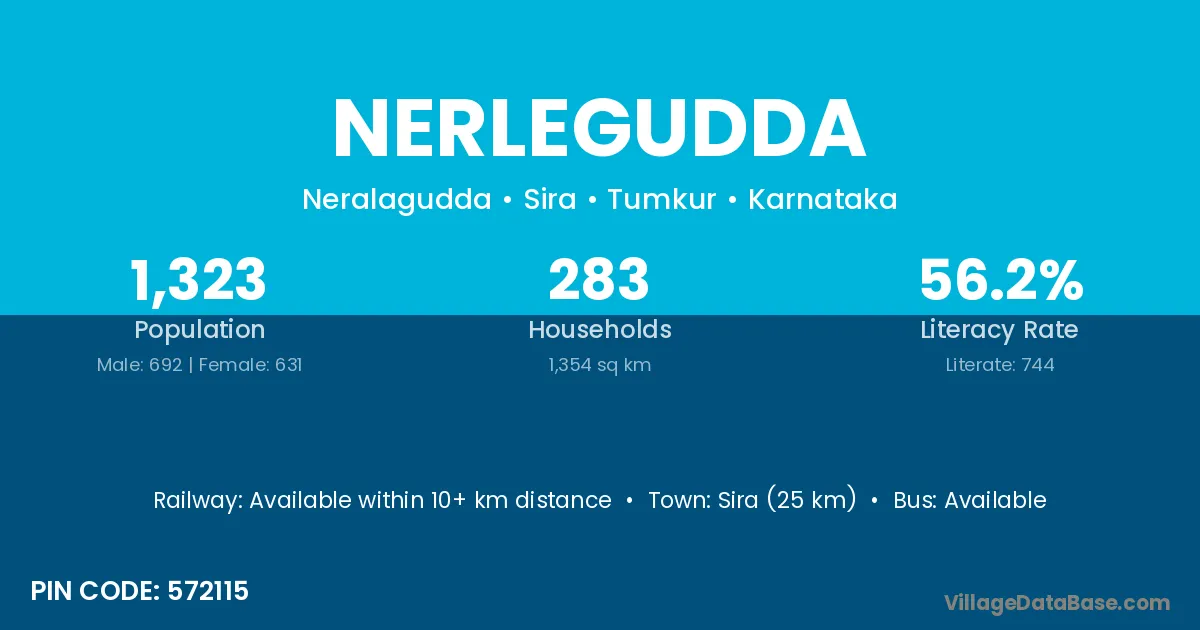 Sira (25 km) is the nearest town to Nerlegudda village for major economic activities and is located approximately 25 km away.