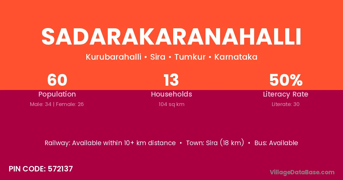 Sadarakaranahalli village has a total population of 60 people, of which 34 are males and 26 are females.