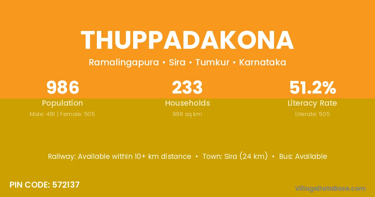 Sira (24 km) is the nearest town to Thuppadakona village for major economic activities and is located approximately 24 km away.