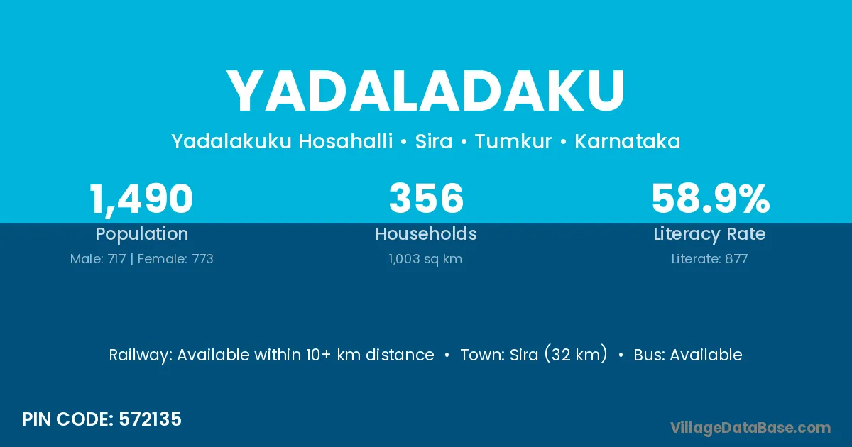 Sira (32 km) is the nearest town to Yadaladaku village for major economic activities and is located approximately 32 km away.