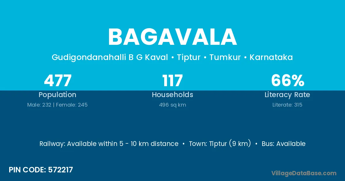 Tiptur (9 km) is the nearest town to Bagavala village for major economic activities and is located approximately 9 km away.