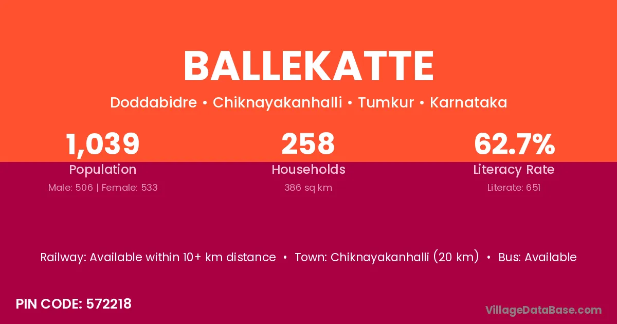 Tiptur (17 km) is the nearest town to Ballekatte village for major economic activities and is located approximately 17 km away.