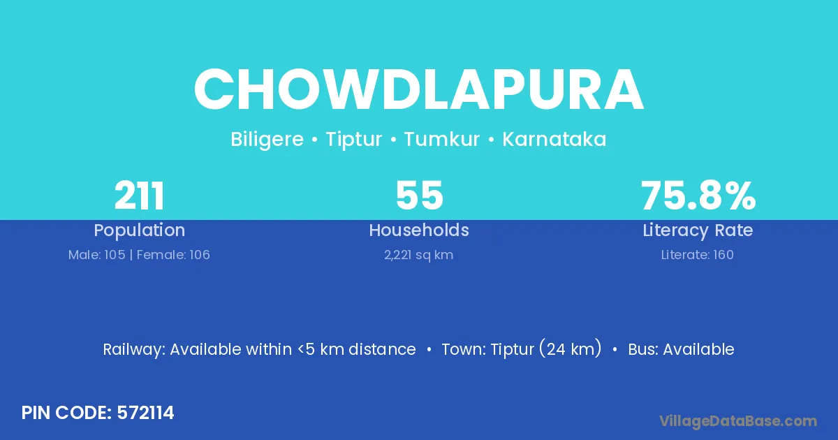 Tiptur (24 km) is the nearest town to Chowdlapura village for major economic activities and is located approximately 24 km away.