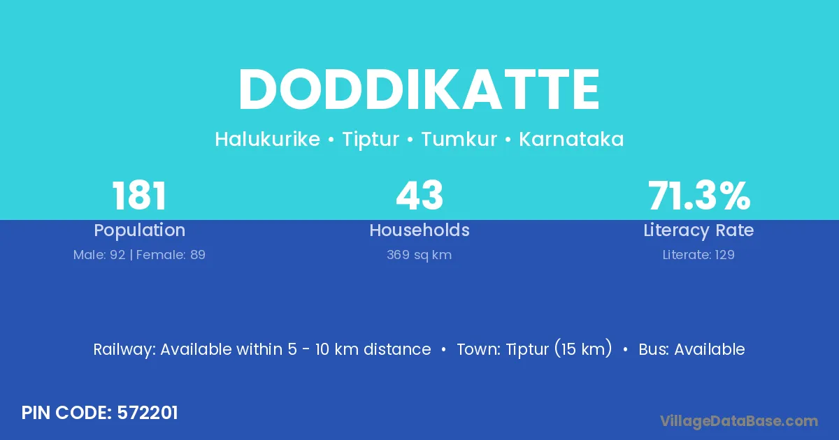 Tiptur (15 km) is the nearest town to Doddikatte village for major economic activities and is located approximately 15 km away.