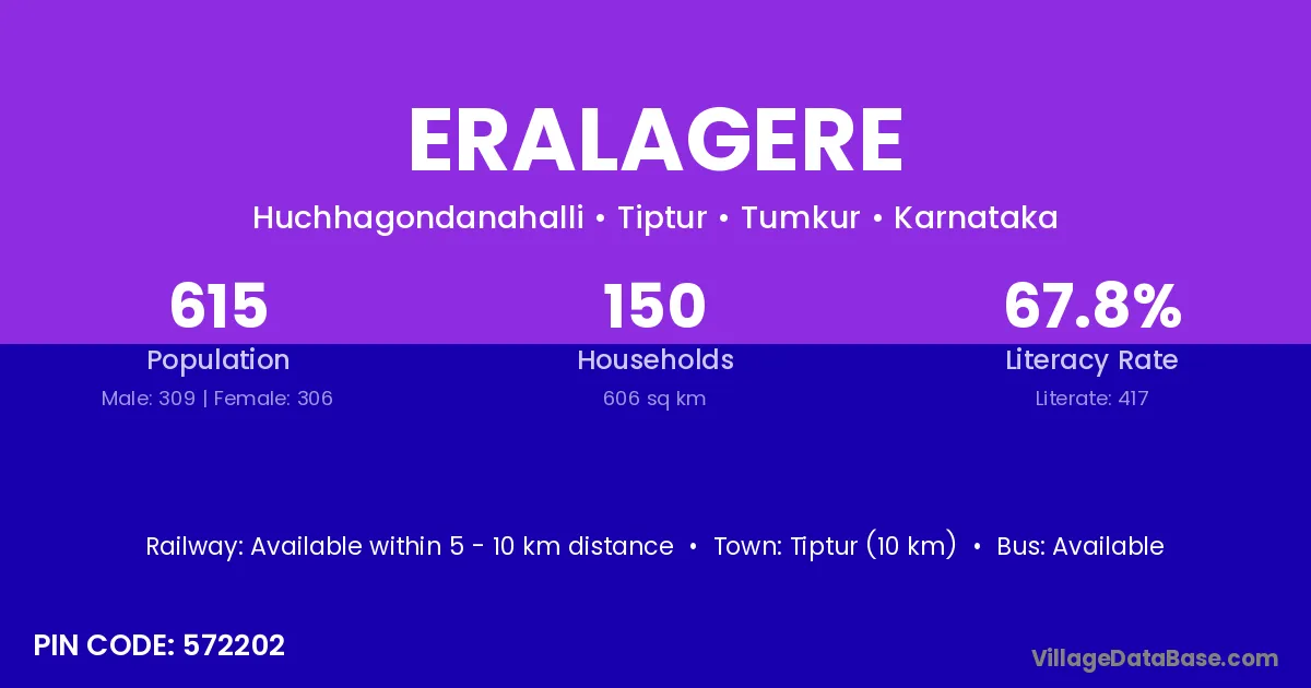 Tiptur (10 km) is the nearest town to Eralagere village for major economic activities and is located approximately 10 km away.