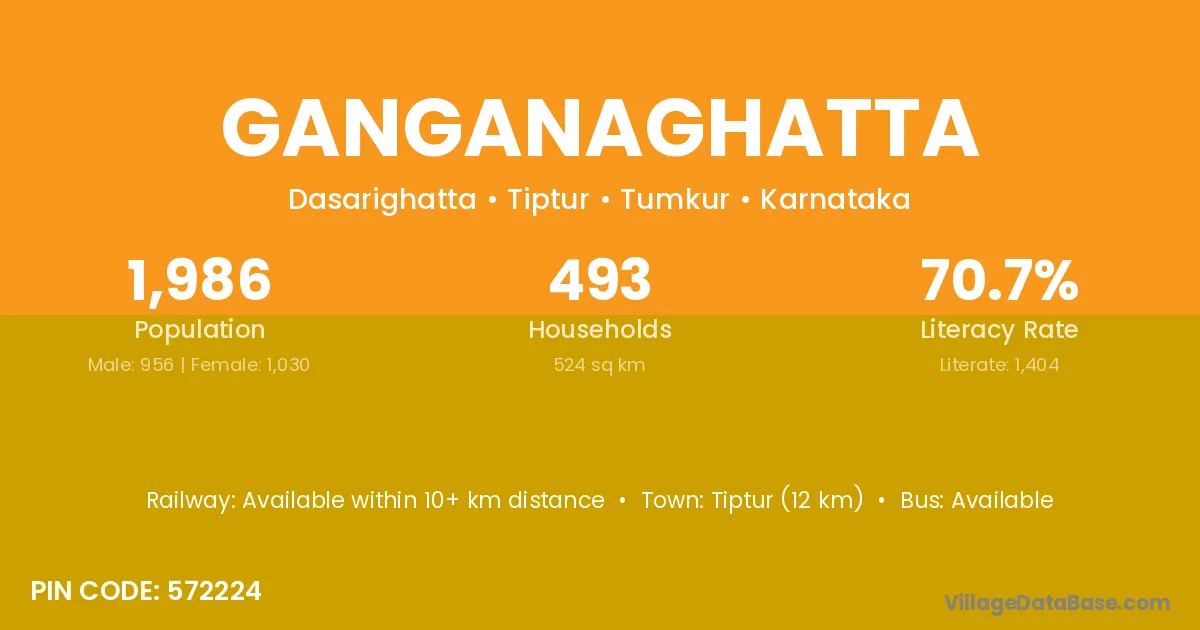 Tiptur (12 km) is the nearest town to Ganganaghatta village for major economic activities and is located approximately 12 km away.