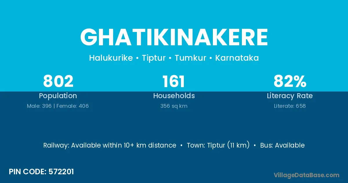 Tiptur (11 km) is the nearest town to Ghatikinakere village for major economic activities and is located approximately 11 km away.